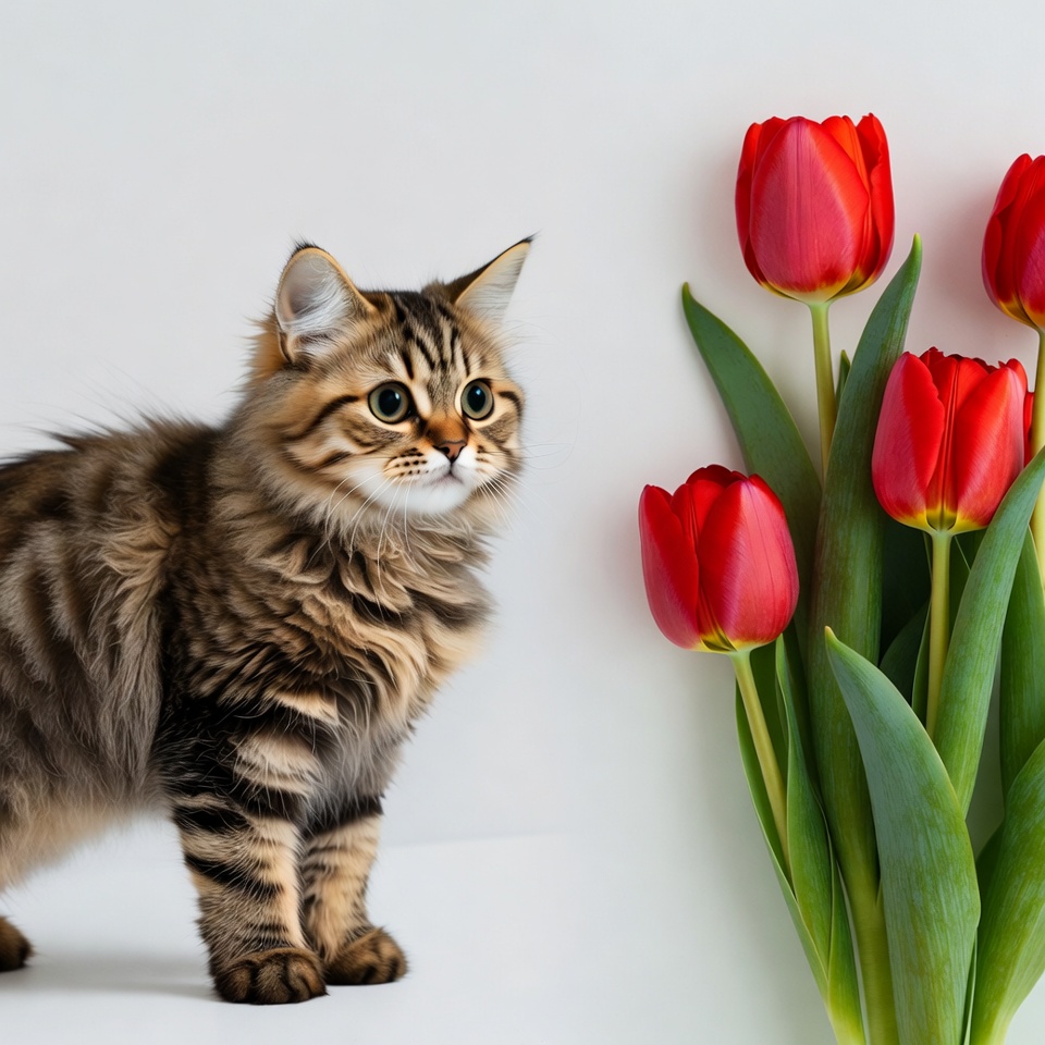 A small cat stands next to a bunch of red tulips. The setting has a plain background. The cat looks at the flowers with curiosity.