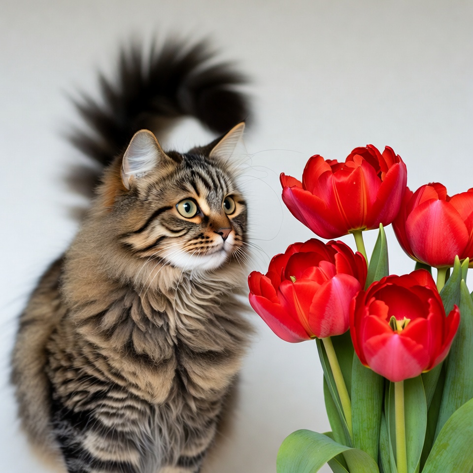 animal, cat, curiosity, cute, decoration, feline, floral, flowers, fur, home, house, indoor, nature, observing, pet, plant, red, room, spring, tulips
