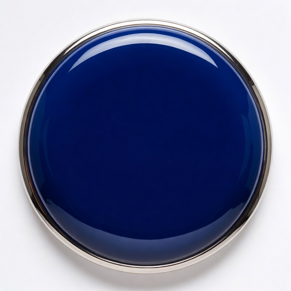 blue plate, ceramic dish, clean lines, color contrast, decorative plate, dining accessory, food plate, home decor, kitchen item, kitchenware, modern style, round dish, round plate, serving dish, shiny finish, silver rim, simple design, table setting, tableware, white background