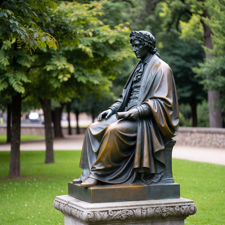 art, base, bronze statue, craftsmanship, culture, detail, green trees, heritage, history, landscape, model, monument, nature, outdoor, park, public space, relaxation, sculpture, seated figure, visitors