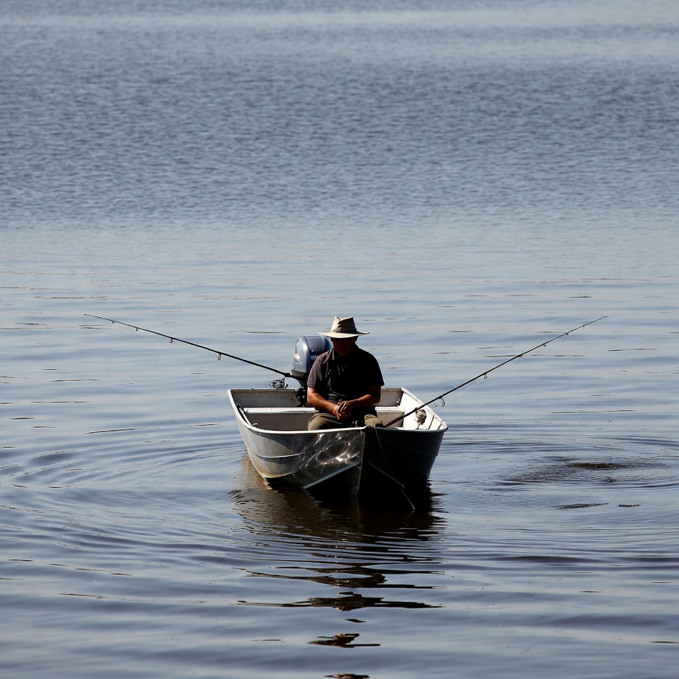 activity, boat, calm, equipment, fishing, hobby, lake, leisure, line, nature, outdoor, person, quiet, reflection, ripples, rod, scene, sport, summer, water