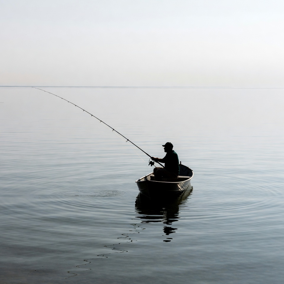 angler, boat, calm, catch, fishing, hobby, lake, line, morning, nature, outdoors, recreation, ripples, rod, silhouette, sport, stillness, sunrise, tranquility, water