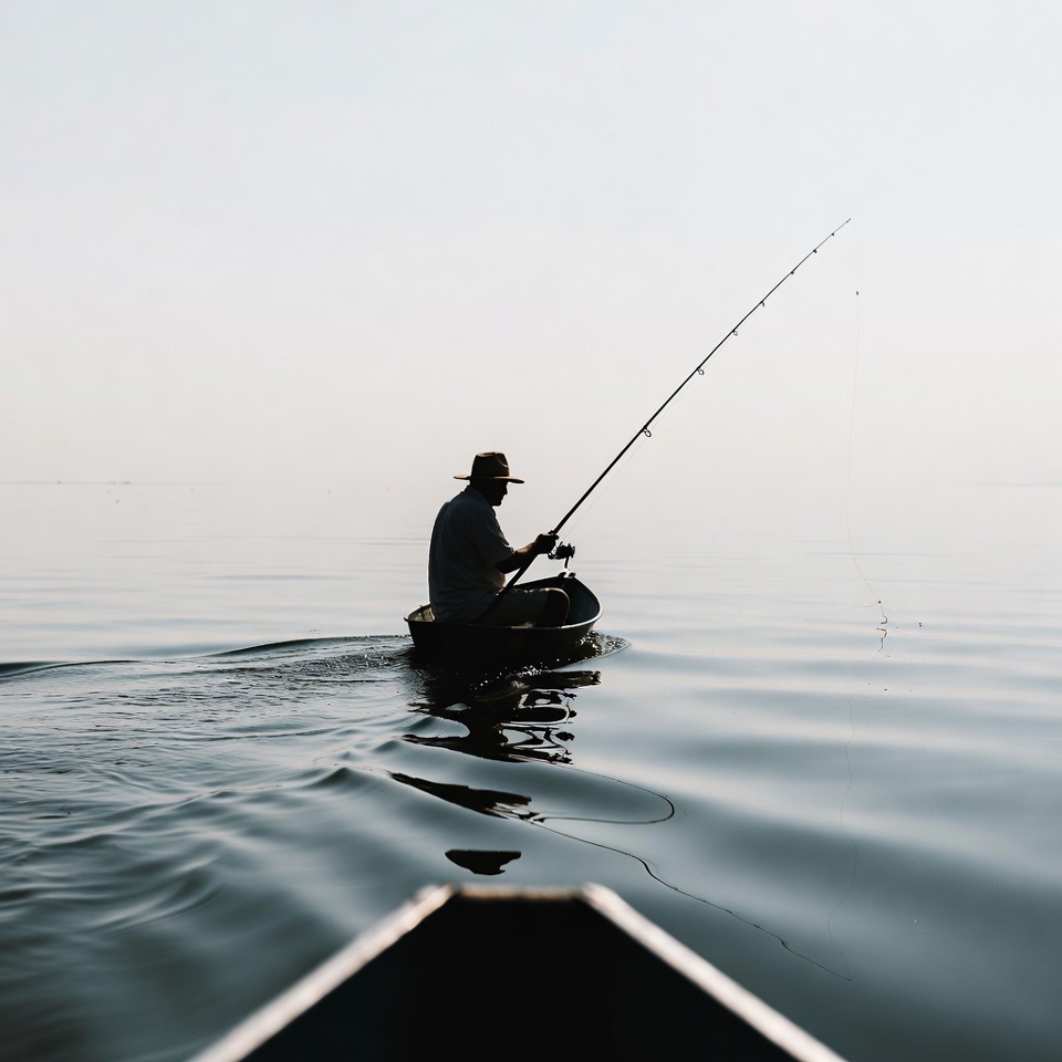 A person sits in a small canoe, fishing quietly in still water during the early morning hours with fog surrounding the scene.