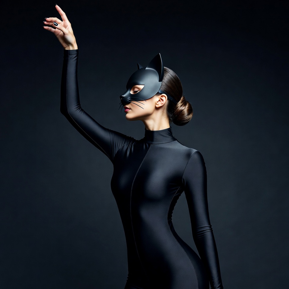 art, black costume, body language, character, costume design, creativity, dark background, design, expression, fashion, hand, mask, model, movement, performance, pose, silhouette, studio, styling, theatrical
