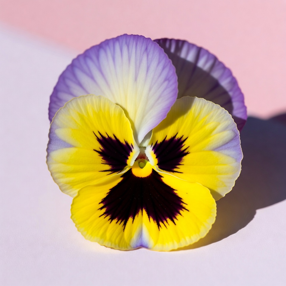 A close view of a yellow pansy flower shows its vibrant colors and petal shapes. The flower rests against a soft pink background.