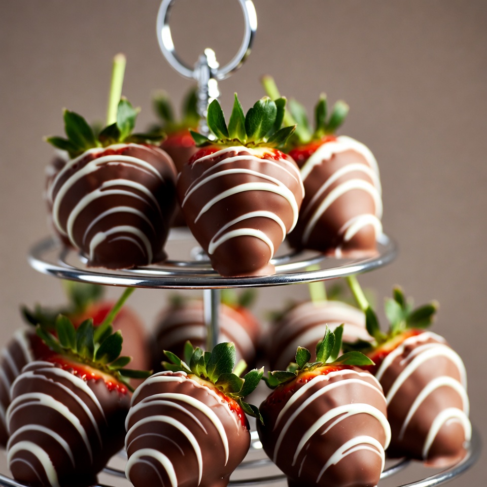 Fresh strawberries are dipped in chocolate and arranged on a three-tier stand. The setting is simple and highlights the treats.
