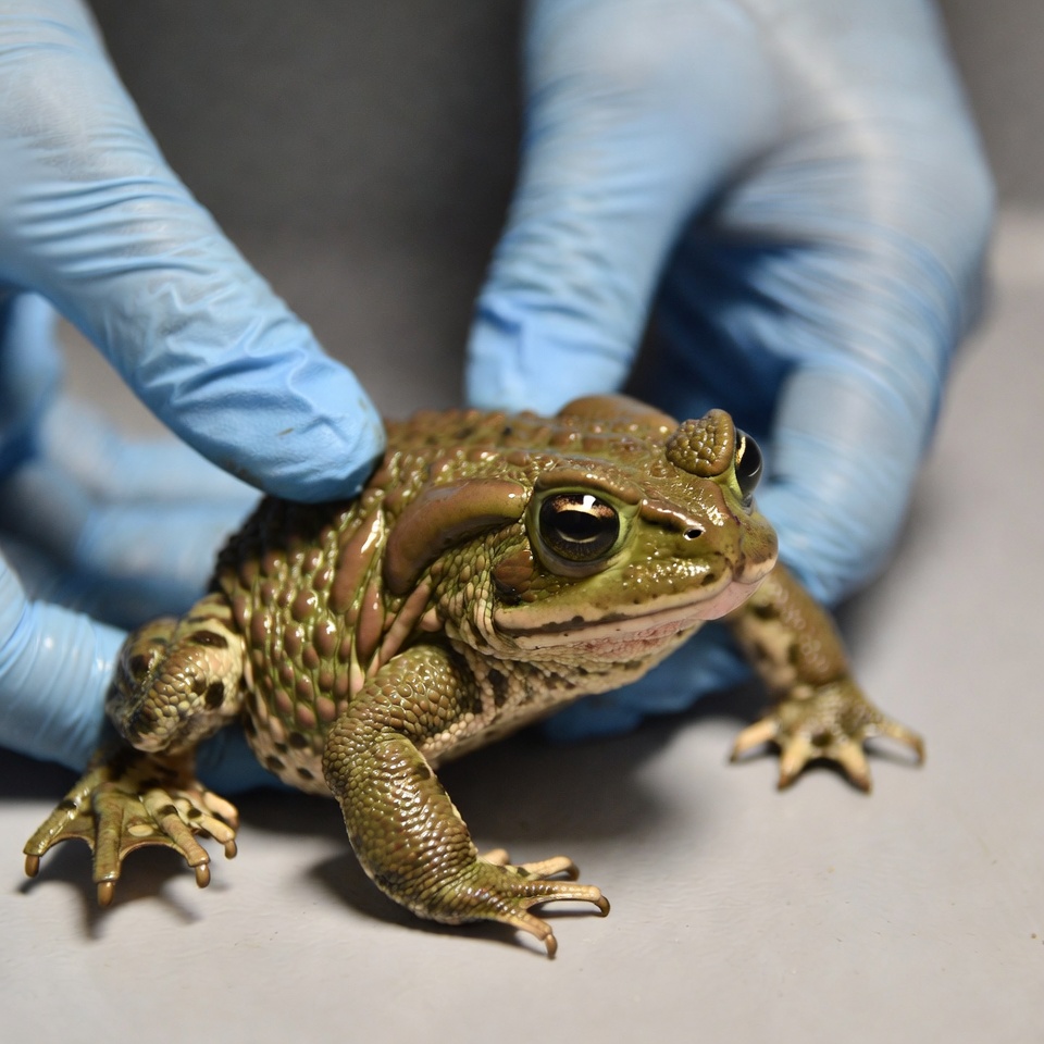 A person in gloves holds a frog in a lab. The frog shows significant detail in its skin and features. The setting is indoors.