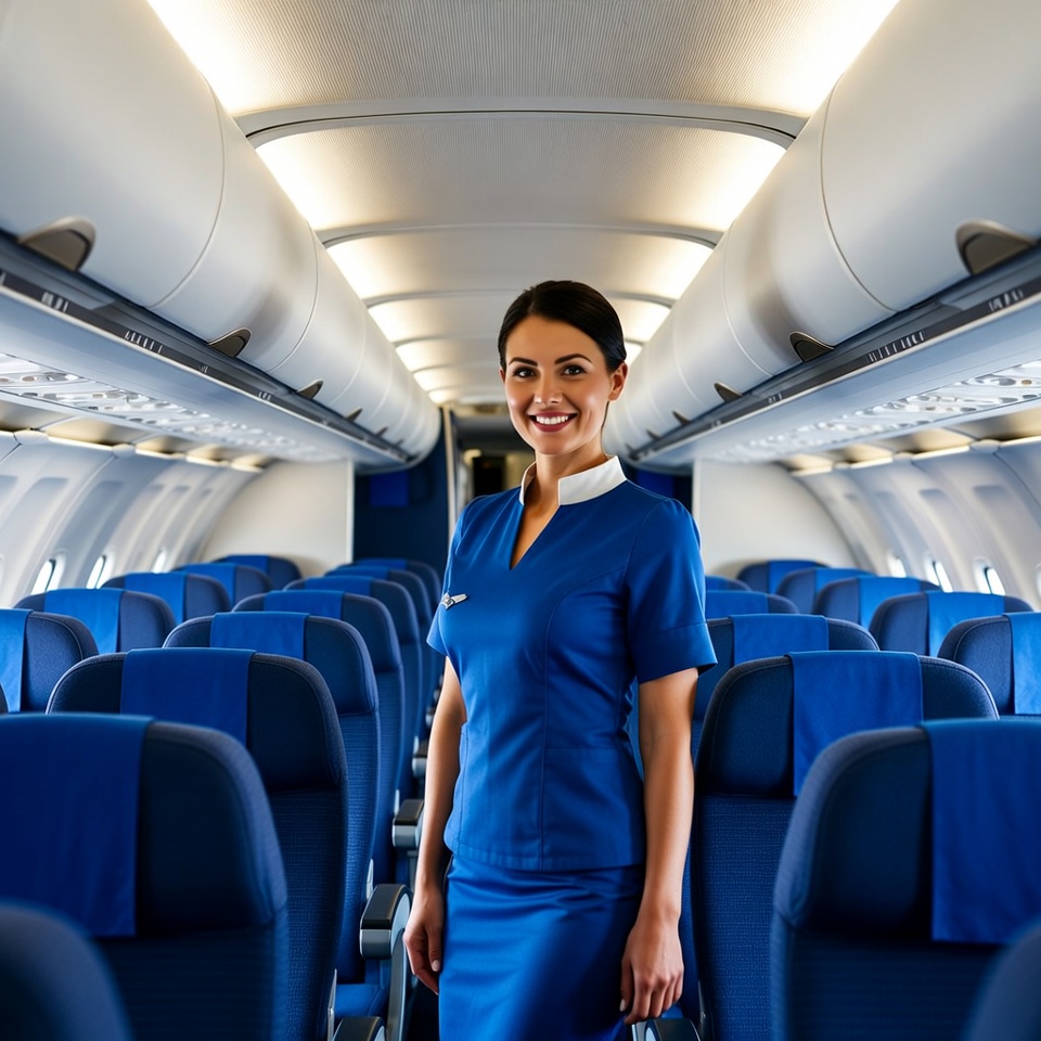 airline, airplane, airplane cabin, aviation, blue seats, crew member, empty rows, flight attendant, hospitality, industry, interior, journey, lighting, passengers, professional, seating, service, smiling, travel, uniform