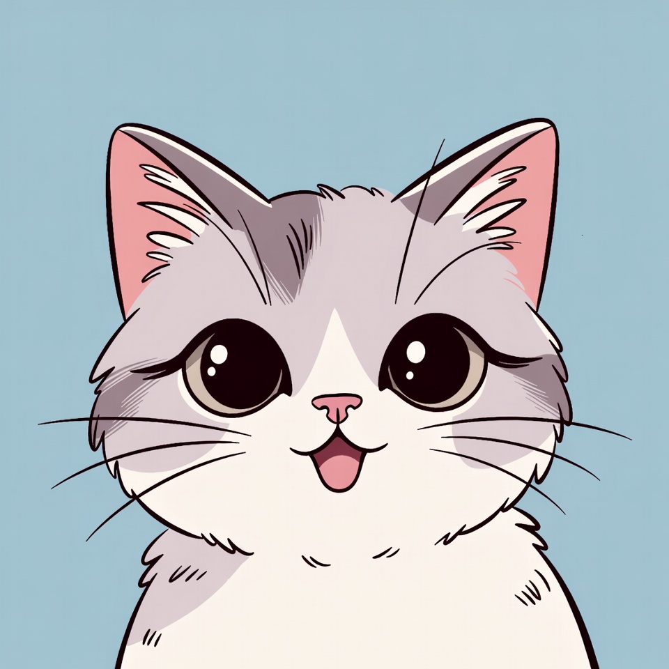 A cartoon cat with large eyes and a happy expression is shown. The background is a light color that makes the cat stand out.
