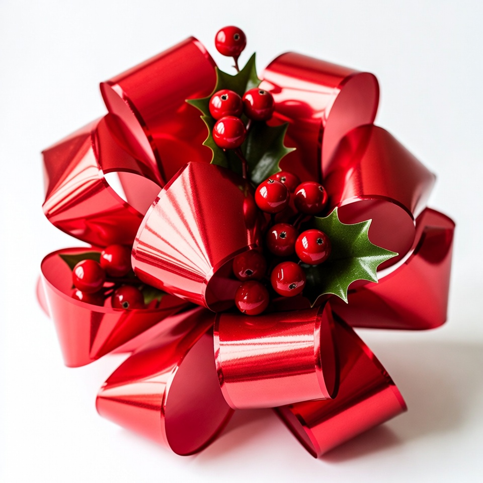 A red ribbon bow sits on a white surface. The bow features berries and leaves, ready for decoration on a gift or present.