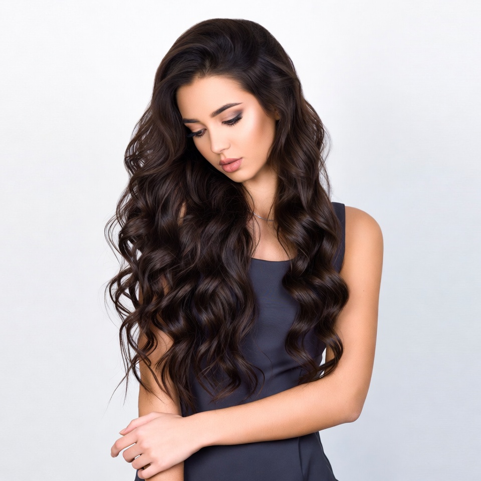 A woman stands with her long, dark, wavy hair cascading down. She is facing slightly to the side, wearing a simple top.