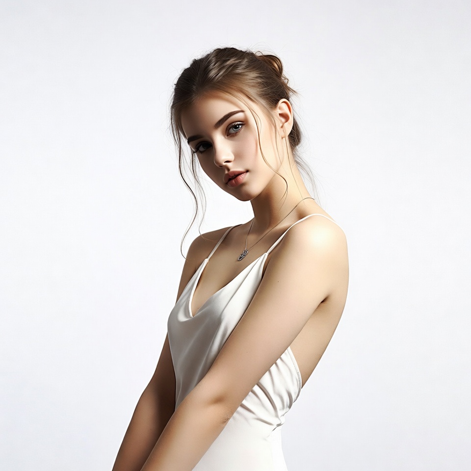beauty, body language, confidence, elegance, fashion, graceful, hairstyle, indoor, lighting, long hair, model, natural pose, neutral expression, portrait, posing, simplicity, studio, style, white outfit, young woman