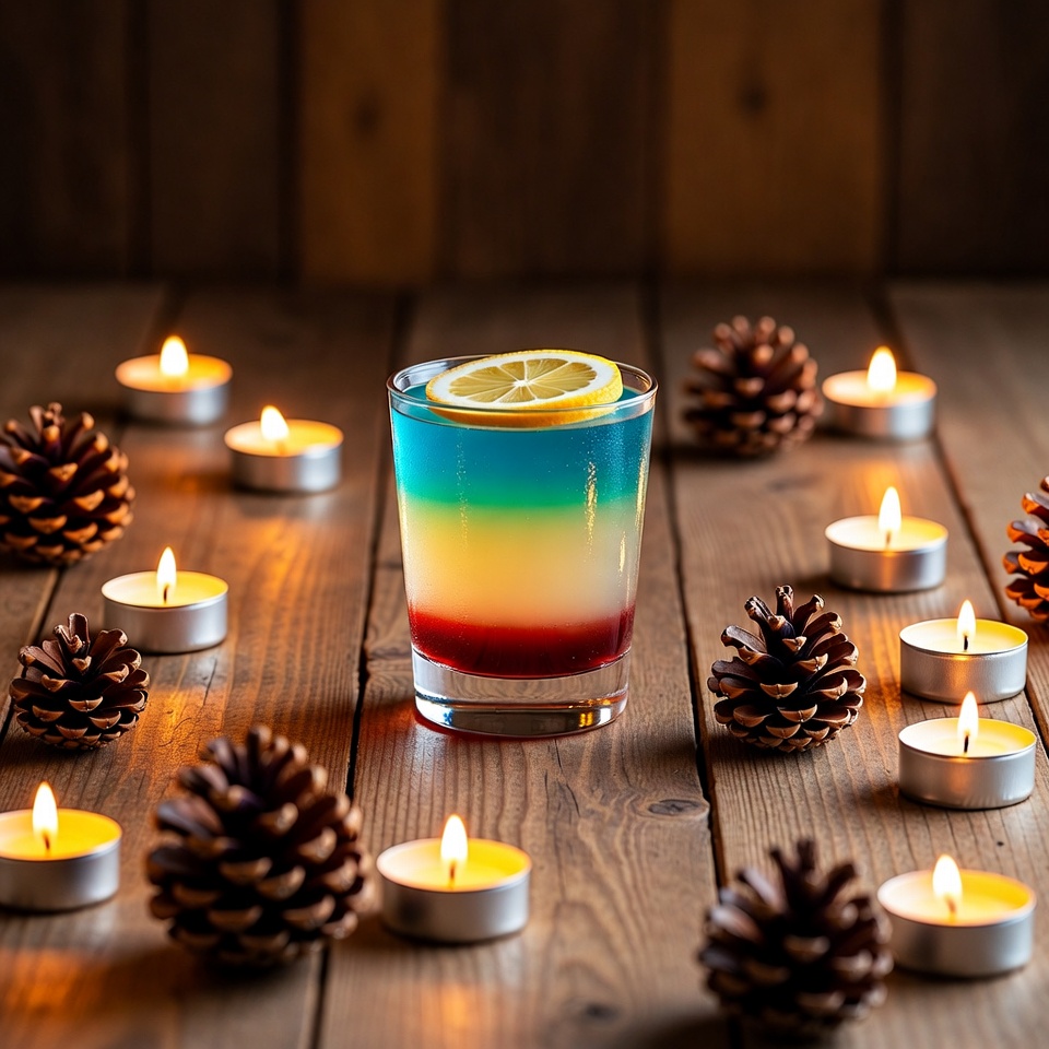 A drink with blue, white, and red layers sits on a wooden table surrounded by lit candles and pinecones during a cozy evening.