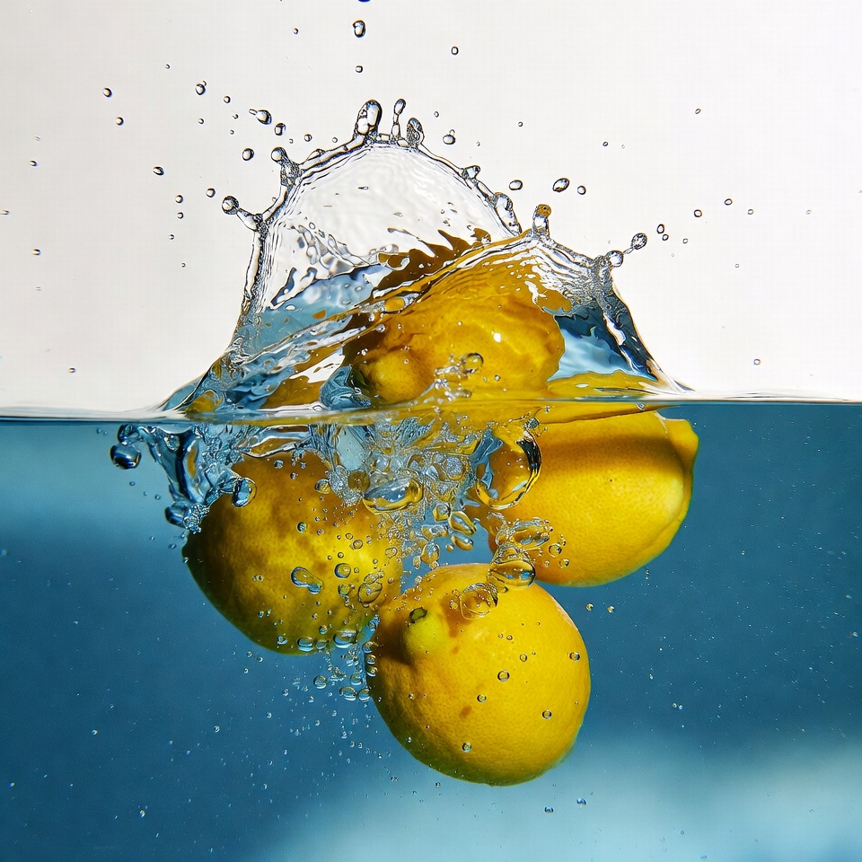 Lemons enter water creating splashes. Bubbles form as they sink below the surface. Bright color contrasts with clear liquid.