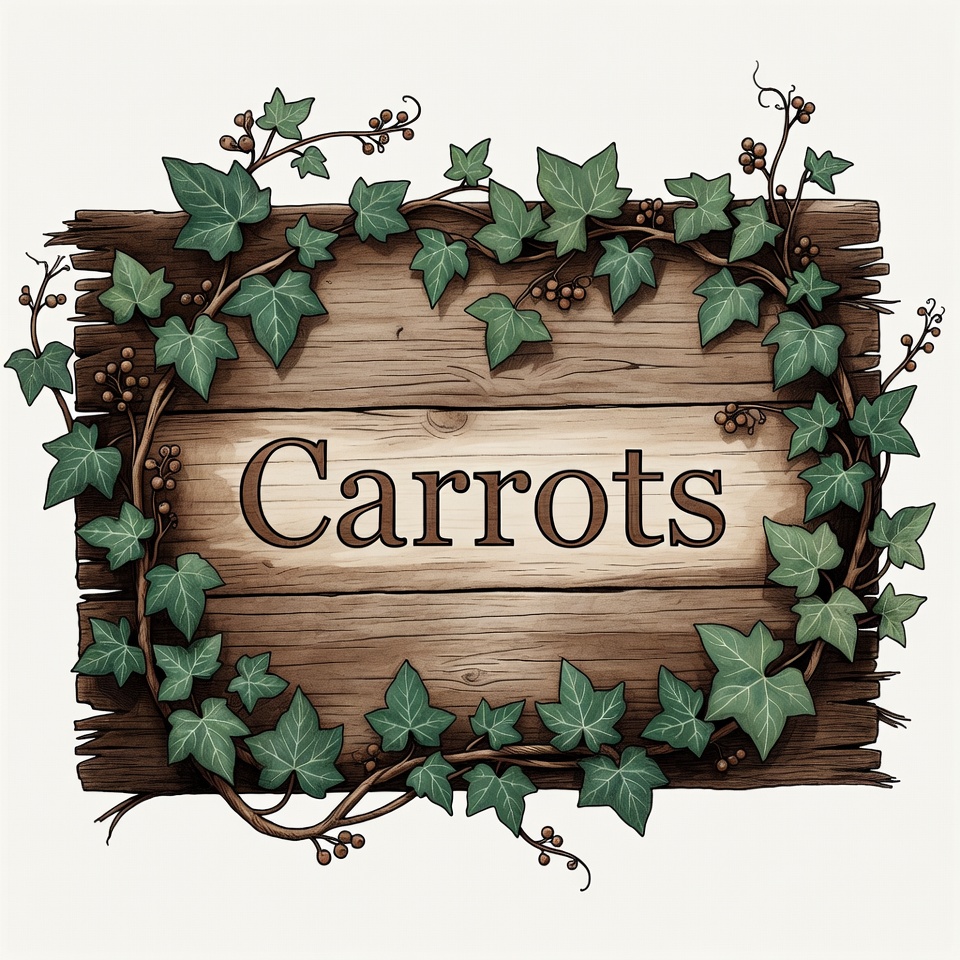 A wooden sign displays the word carrots surrounded by ivy leaves. It is designed with a rustic and natural look.