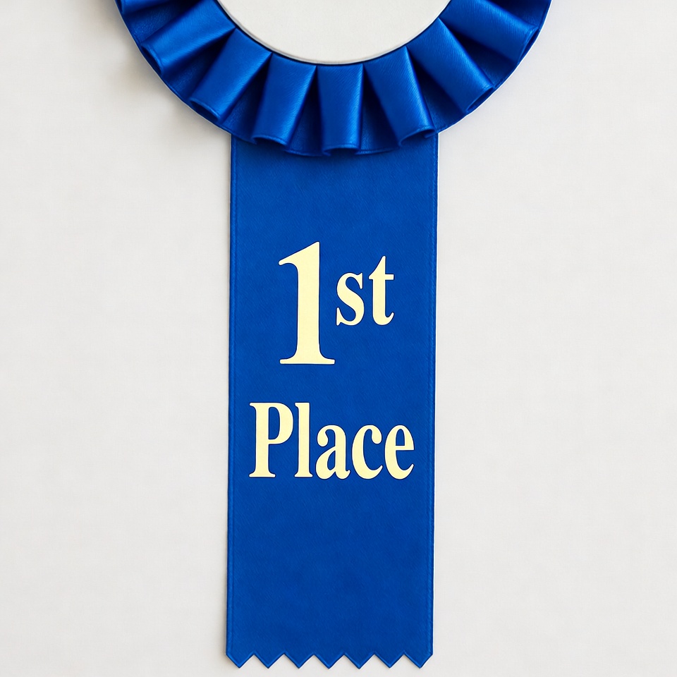 A blue ribbon is hanging, showing the text '1st Place'. It signifies a winner in a contest or competition event.