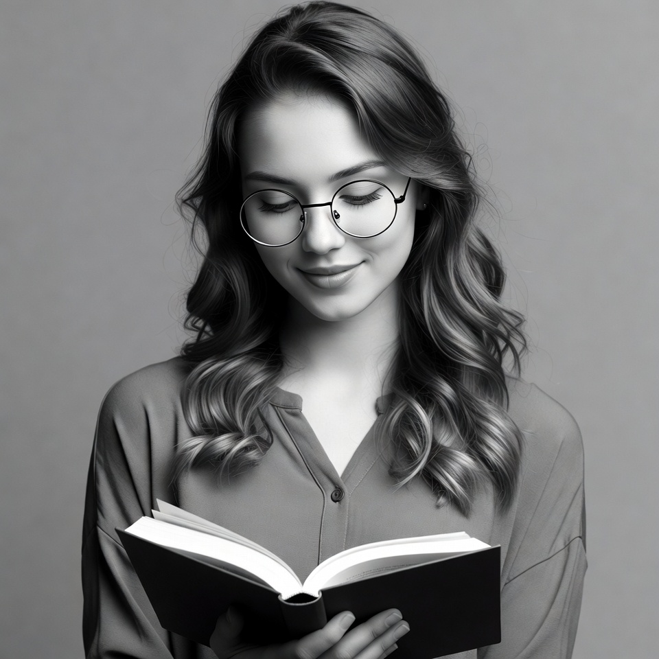 A young woman with glasses reads a book while sitting indoors. She has long hair and appears focused on her reading activity.