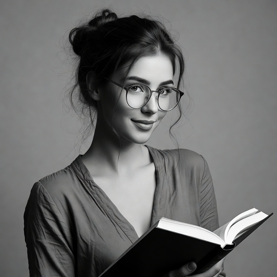 A young woman stands holding an open book. She wears glasses and looks directly at the viewer. The background is gray and simple.