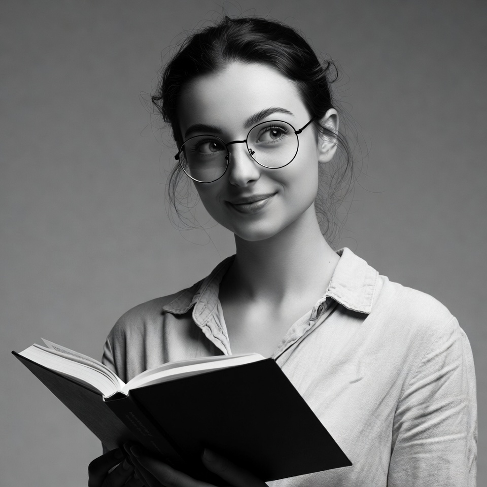 A young woman stands indoors holding a book. She wears glasses and looks at the camera with a slight smile while reading.