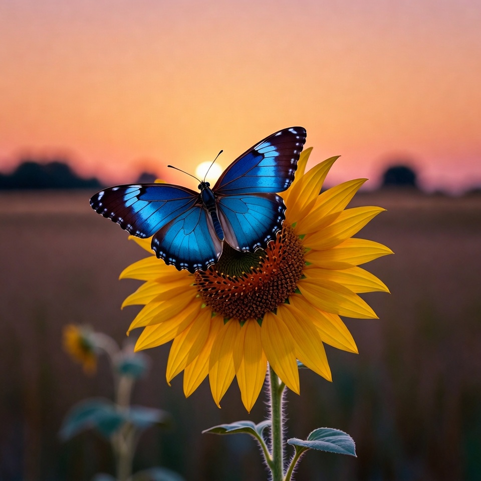 A blue butterfly sits on a sunflower as the sun sets in the background. The sky shows shades of orange and purple during twilight.