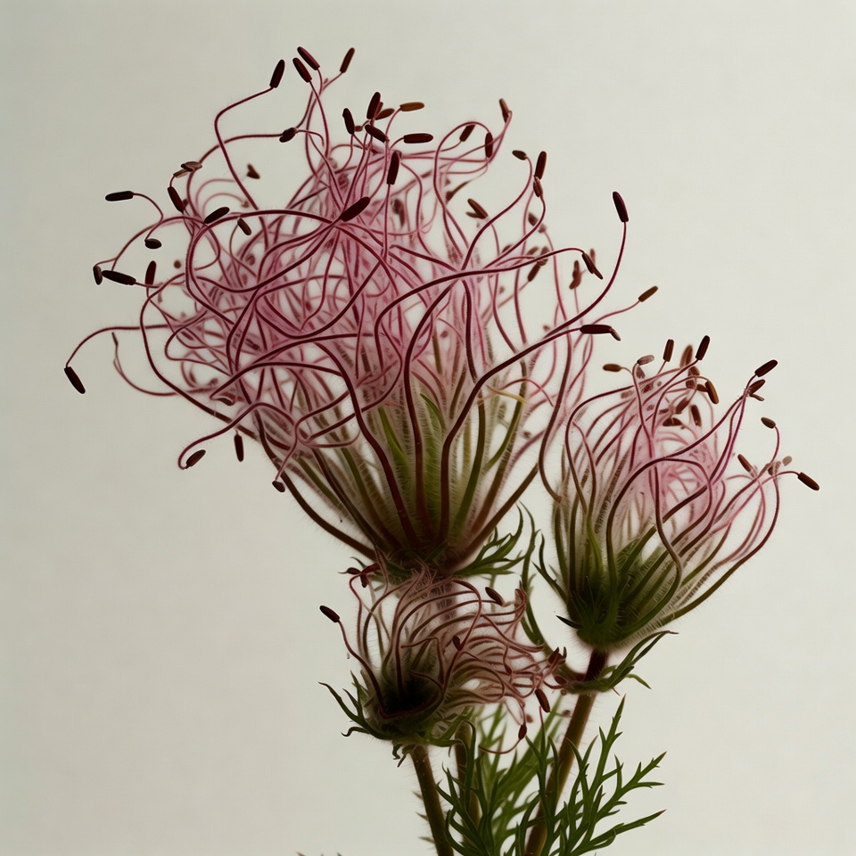 A flower with distinct curly petals is shown. The petals are pink with thin strands, resting against a plain background.