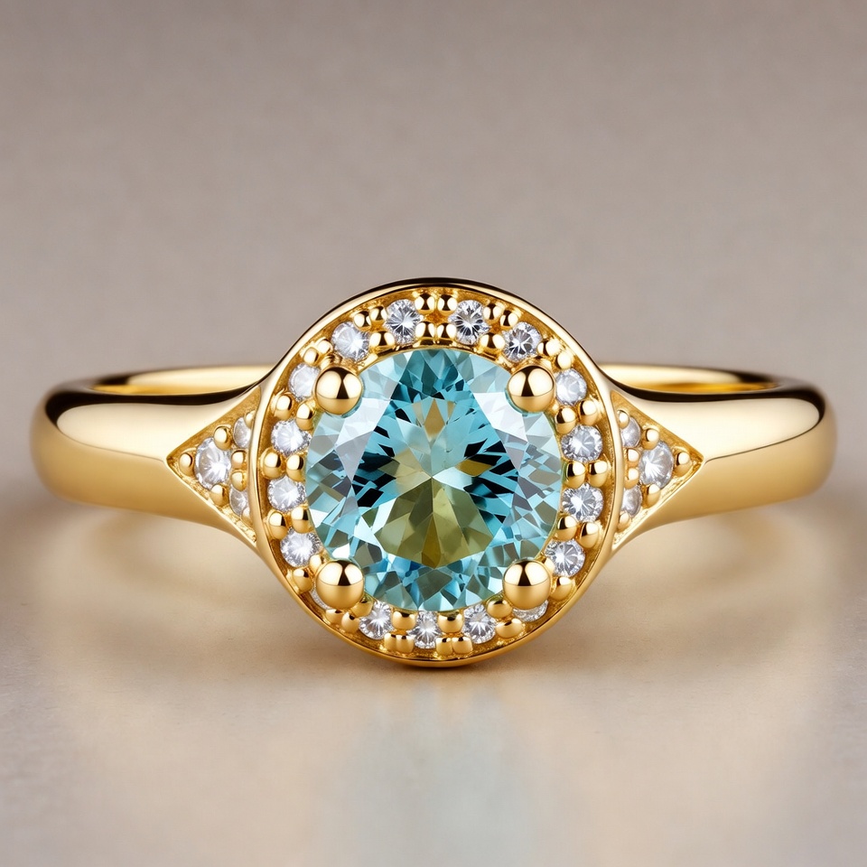 A gold ring features a round blue stone surrounded by small diamonds on a smooth surface. The ring has a classic design and shines brightly.