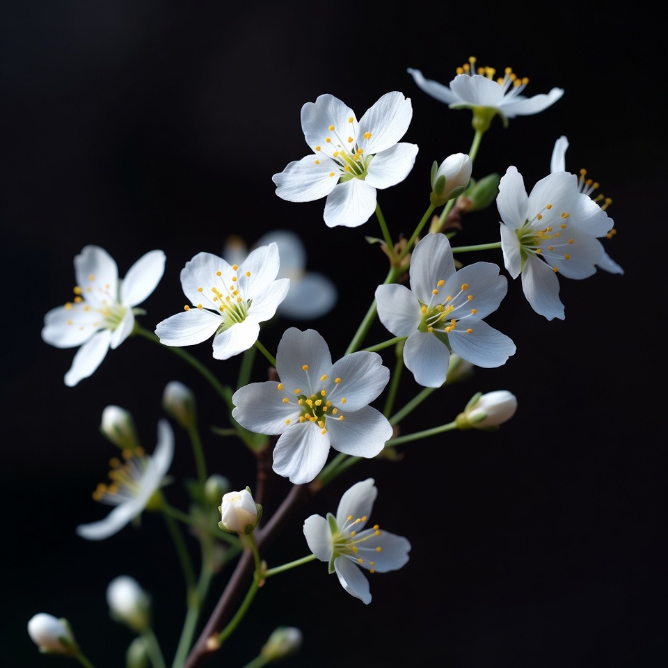 beauty, blooming, blossoms, botanical, branches, close-up, dark background, flora, floral, garden, growth, nature, outdoor, petals, plants, simplicity, spring, tranquility, white flowers, yellow centers