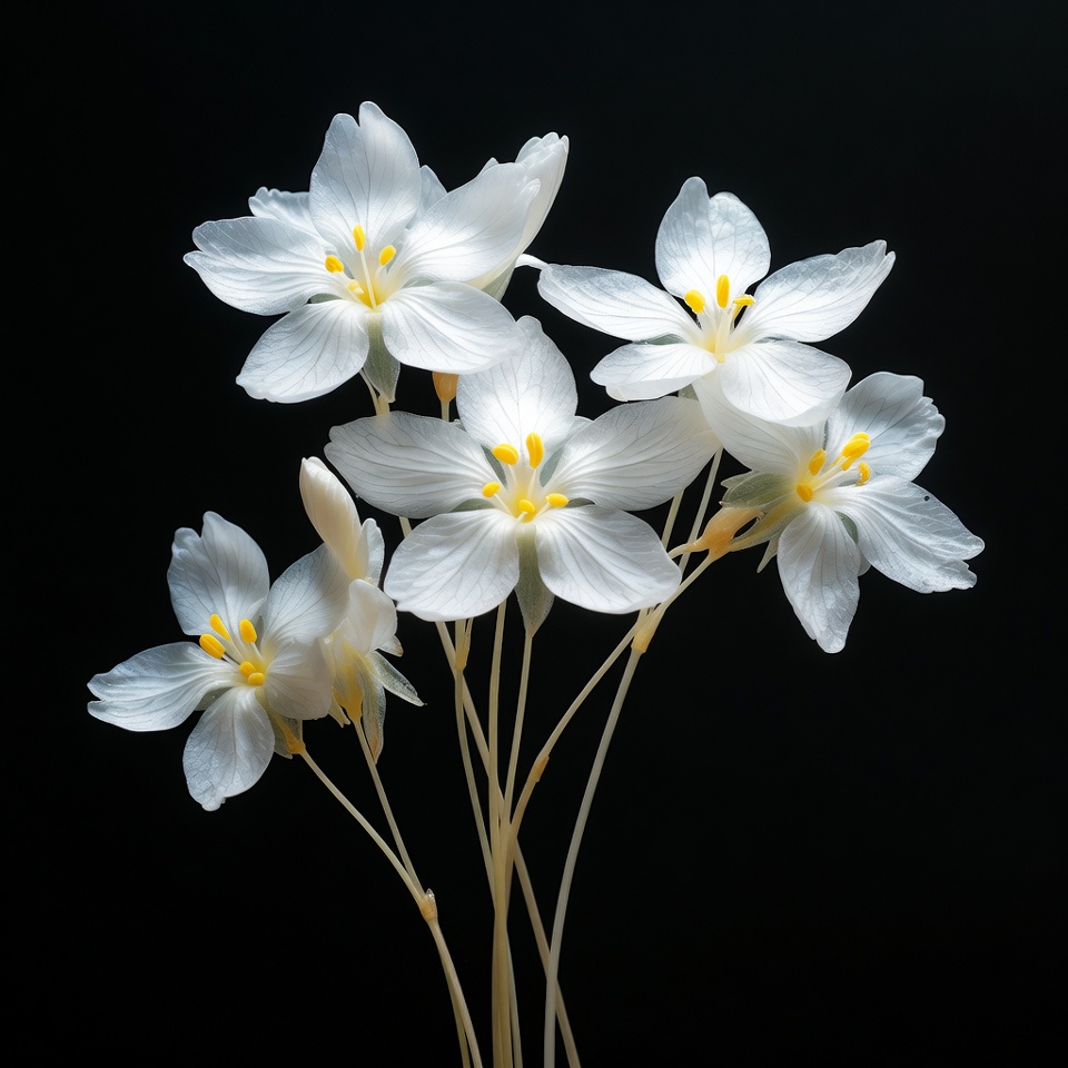 White flowers with yellow centers stand upright against a black background. The petals are delicate and arranged in a natural cluster.