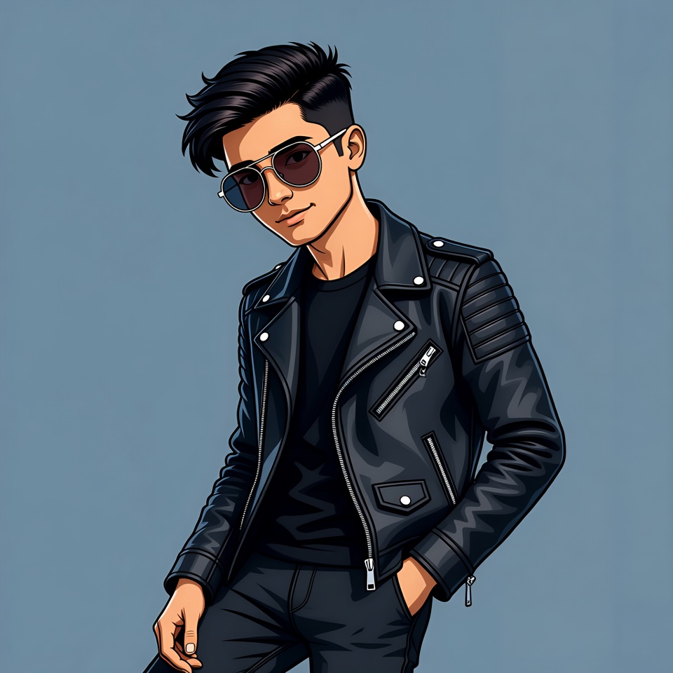 accessories, attitude, blue background, casual wear, character design, confident pose, cool, expression, fashion, hair, leather jacket, male, modern look, portrait, style, sunglasses, trendy, urban outfit, young man, youth
