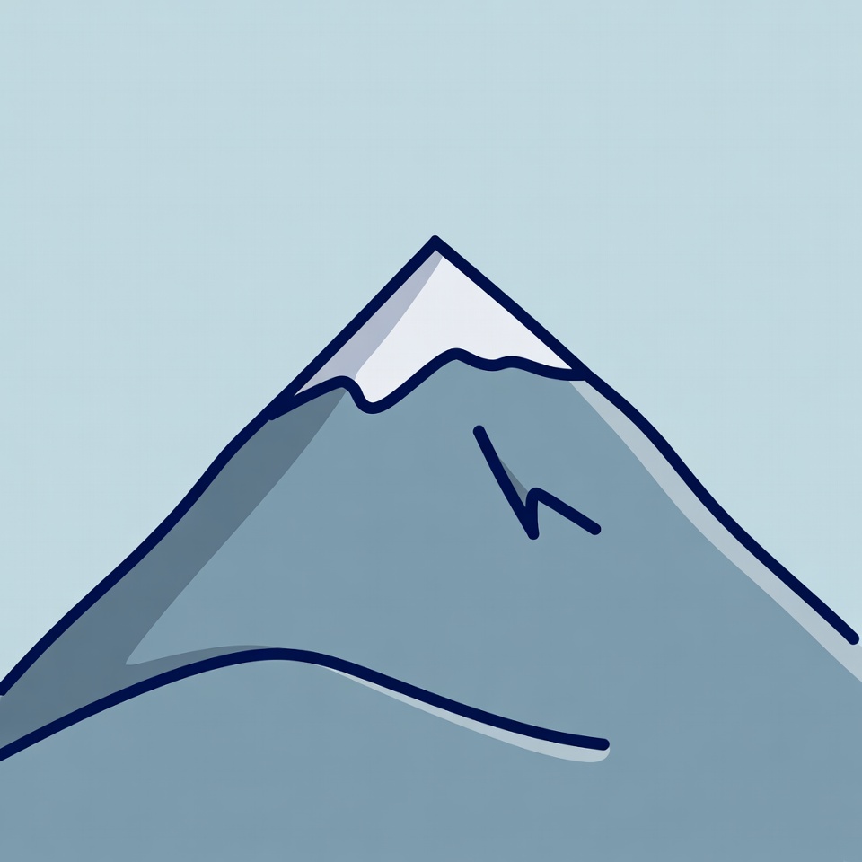 A mountain peak rises against a light background. The summit has a patch of snow, while the slopes are bare. The scene shows high elevation.