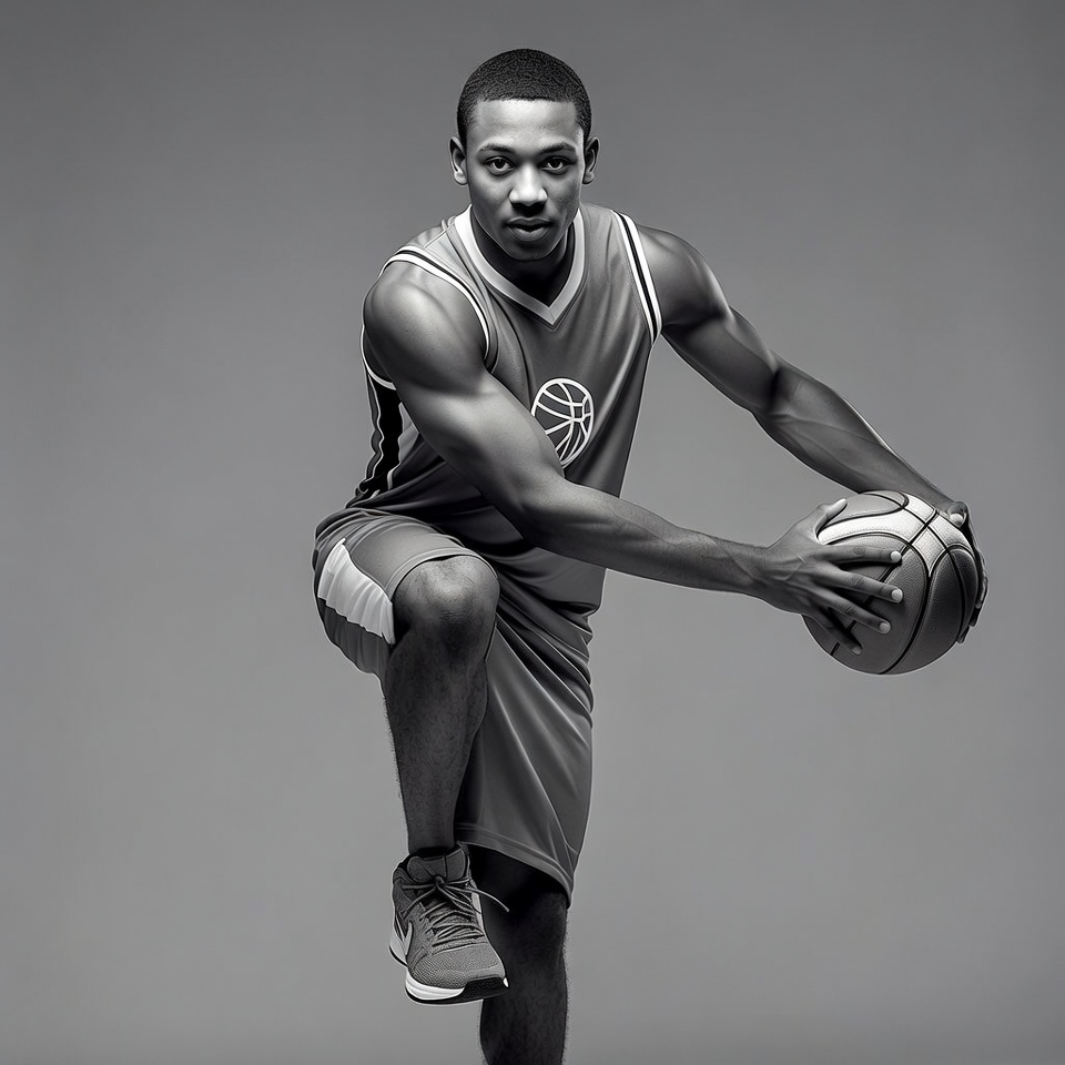 A basketball player poses with a ball, showing his strength and focus during practice in a studio setting with gray backdrop.