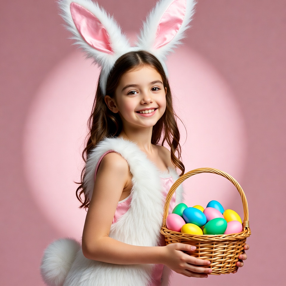 A girl wears bunny ears and holds a basket filled with colorful eggs. The background is light pink, creating a playful atmosphere.