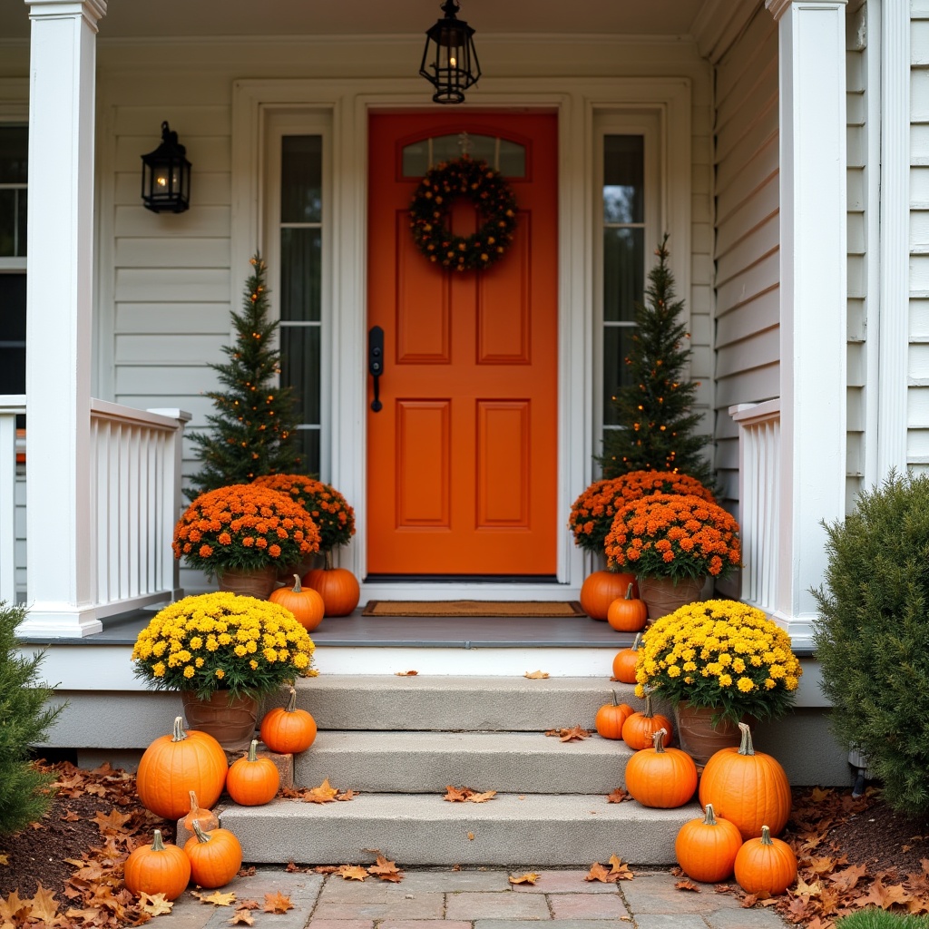 Front porch decorated with orange pumpkins and yellow flowers. Autumn decor enhances the welcoming entrance of the house.
