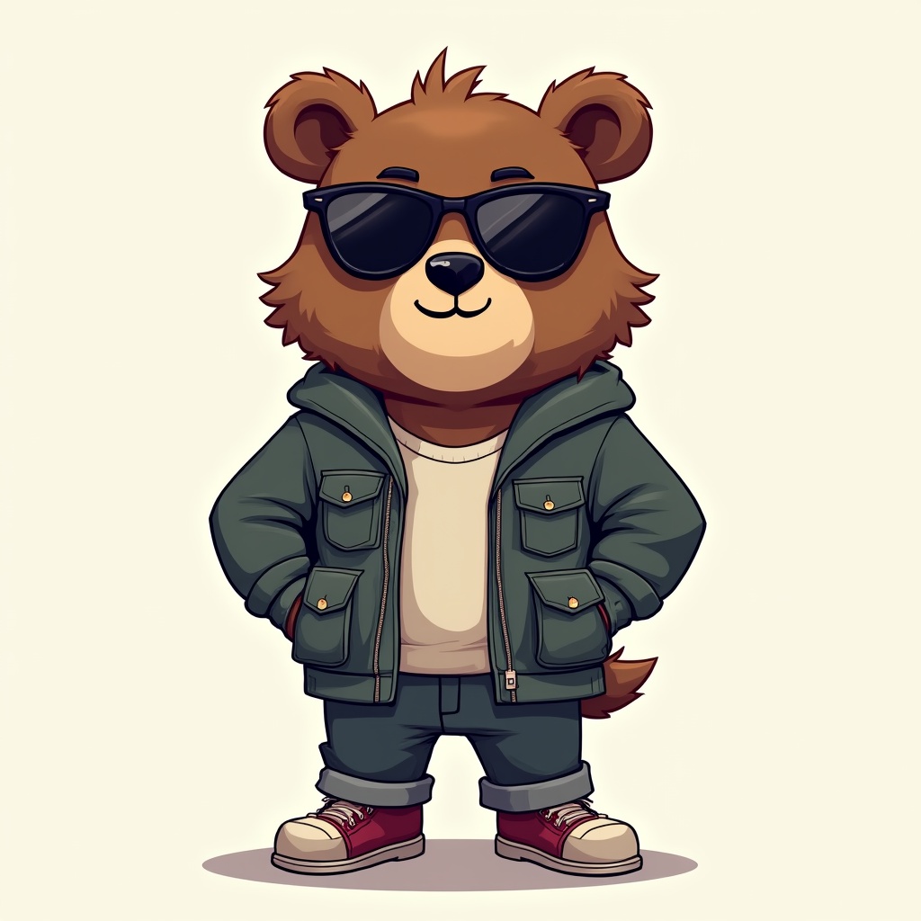 animal, art, bear, brown, cartoon, casual, character, clothing, cool, cute, fashion, friendly, fun, furry, illustration, jacket, playful, standing, sunglasses, urban