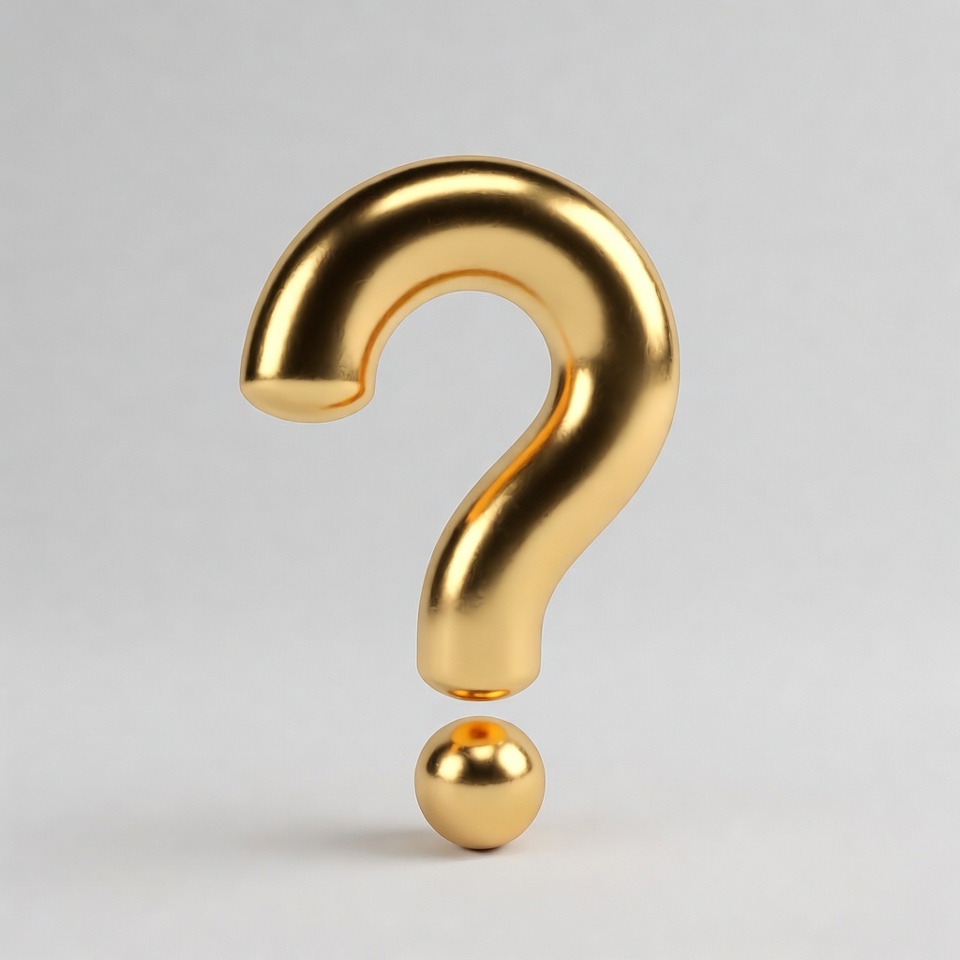 A shiny golden question mark stands upright above a small sphere on a light gray surface with soft lighting.