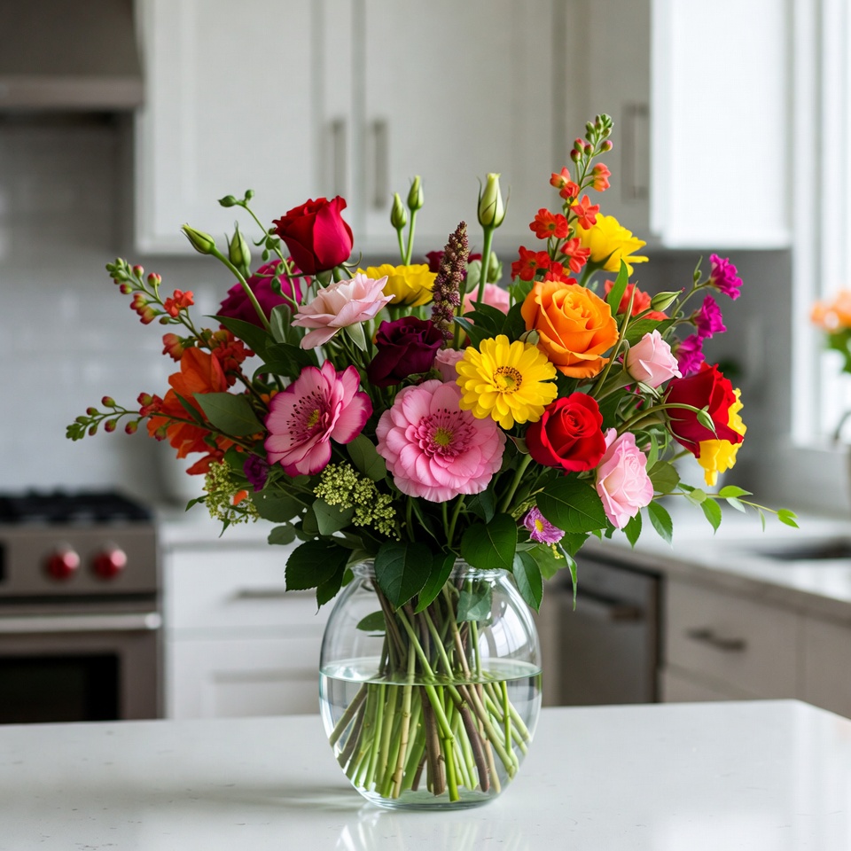 Colorful flower arrangement on kitchen table