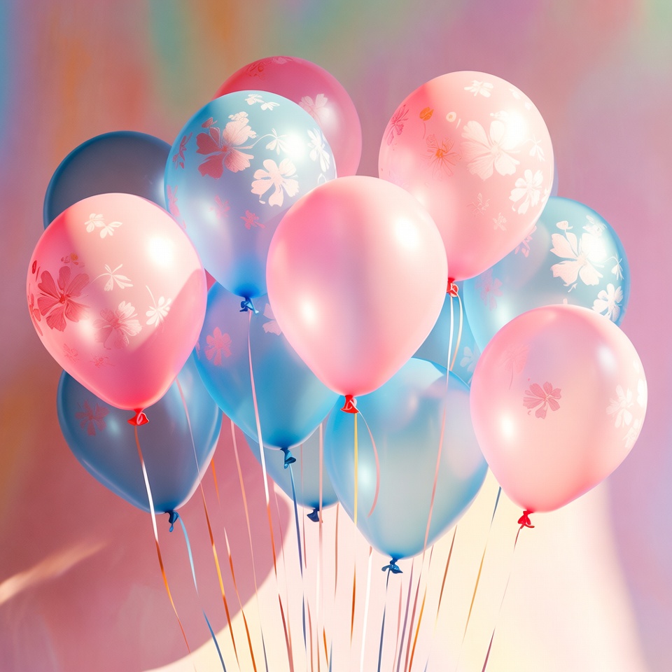Balloons in pink and blue float together, featuring flower patterns, ready for a celebration. The background adds a festive touch.
