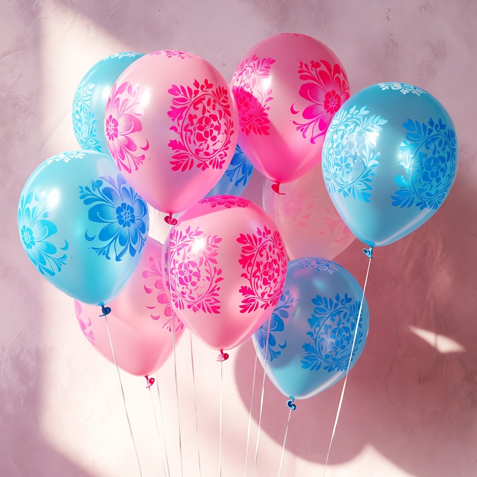 Pink and blue balloons with floral designs float together. Sunlight casts shadows on a light surface, creating a festive scene.