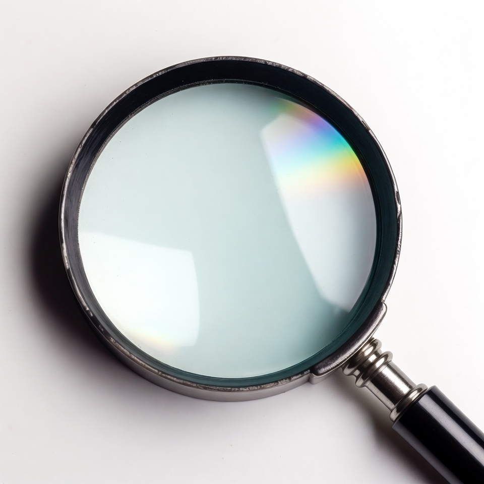 A magnifying glass rests on a white surface. The lens shows a faint rainbow effect reflecting light. It is still and unobtrusive.