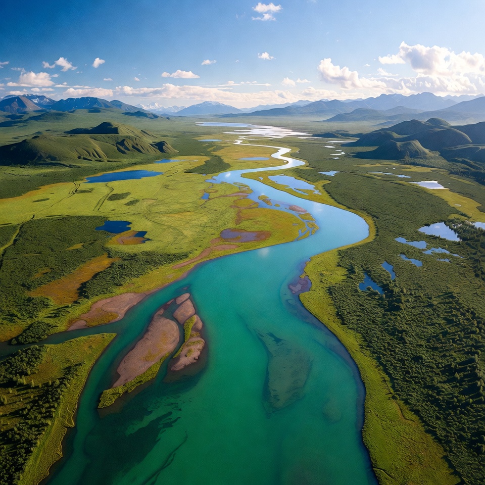 A river flows through a green landscape. Mountains are visible in the distance under a blue sky with clouds.