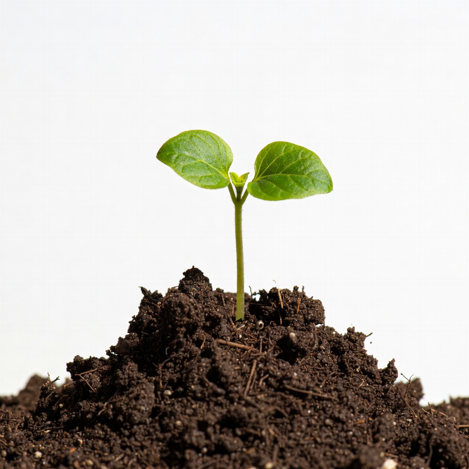A small plant is emerging from dark soil. The leaves are bright and fresh, showing growth in a simple environment.