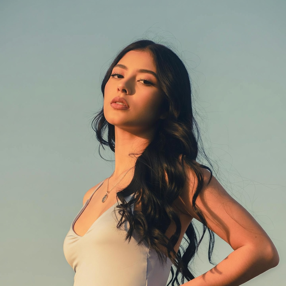 A woman poses outdoors with a confident expression. Her long hair flows as she stands against a clear sky. The sun lights up her features.