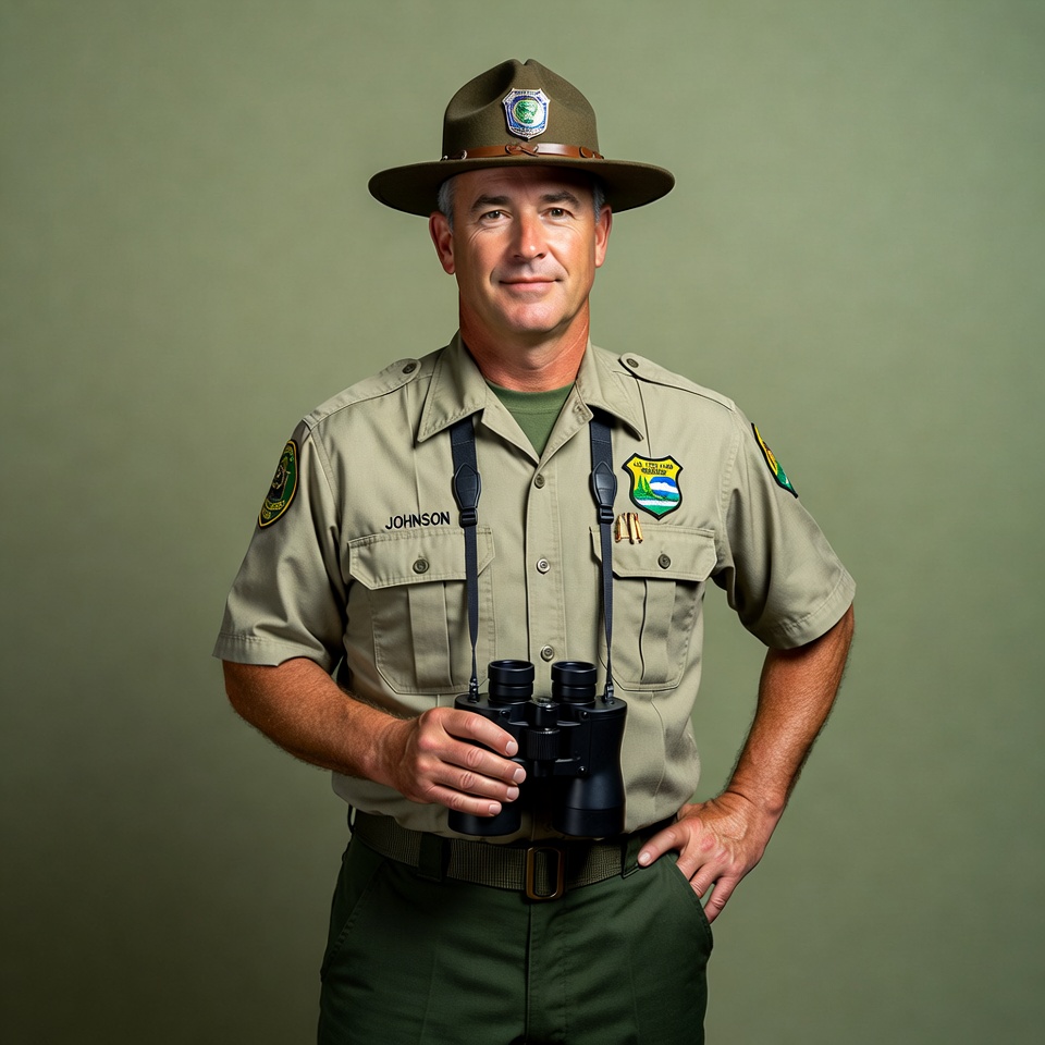 A ranger stands with binoculars in hand, dressed in a uniform. He looks ready for wildlife observation in a natural setting.