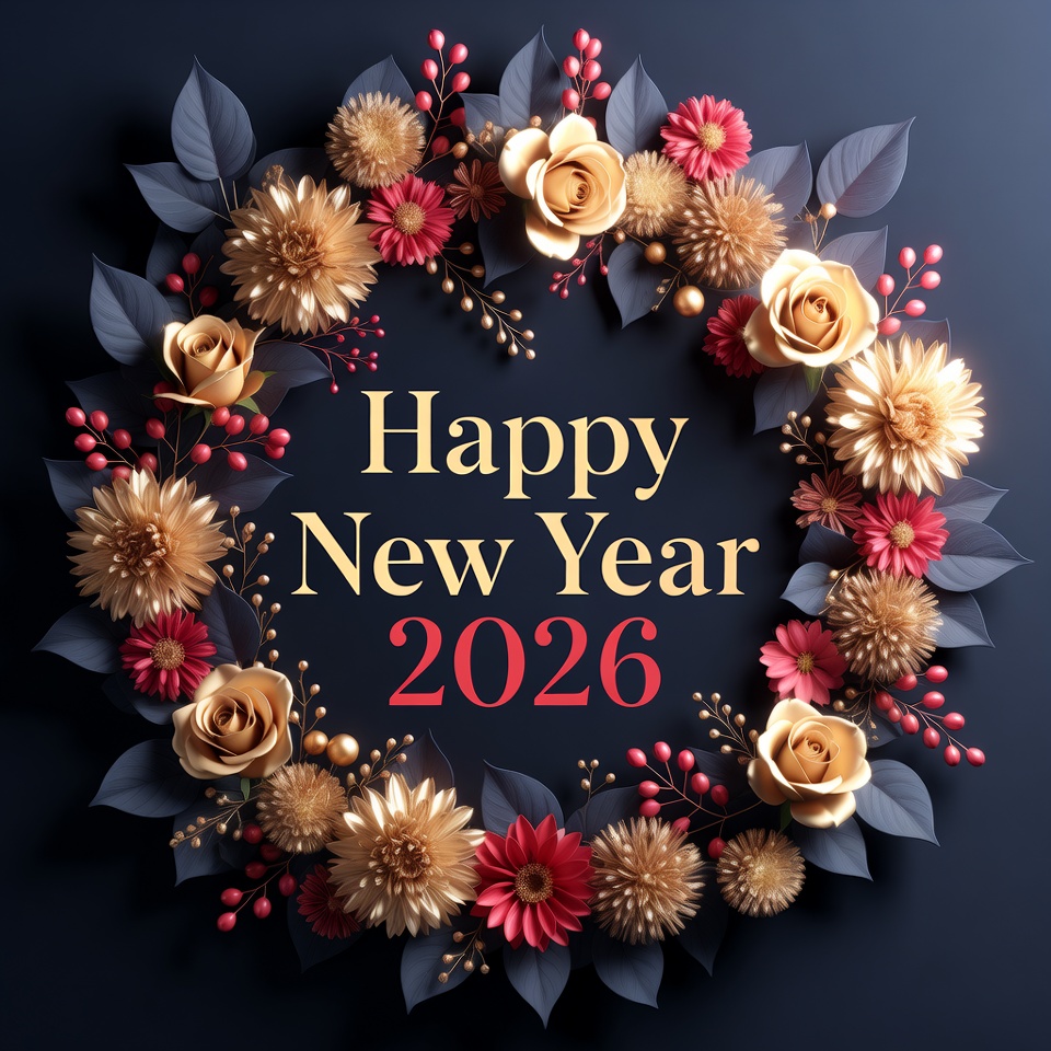 A decorative arrangement showing flowers, leaves, and text that reads Happy New Year 2026. The colors include gold, red, and dark shades.