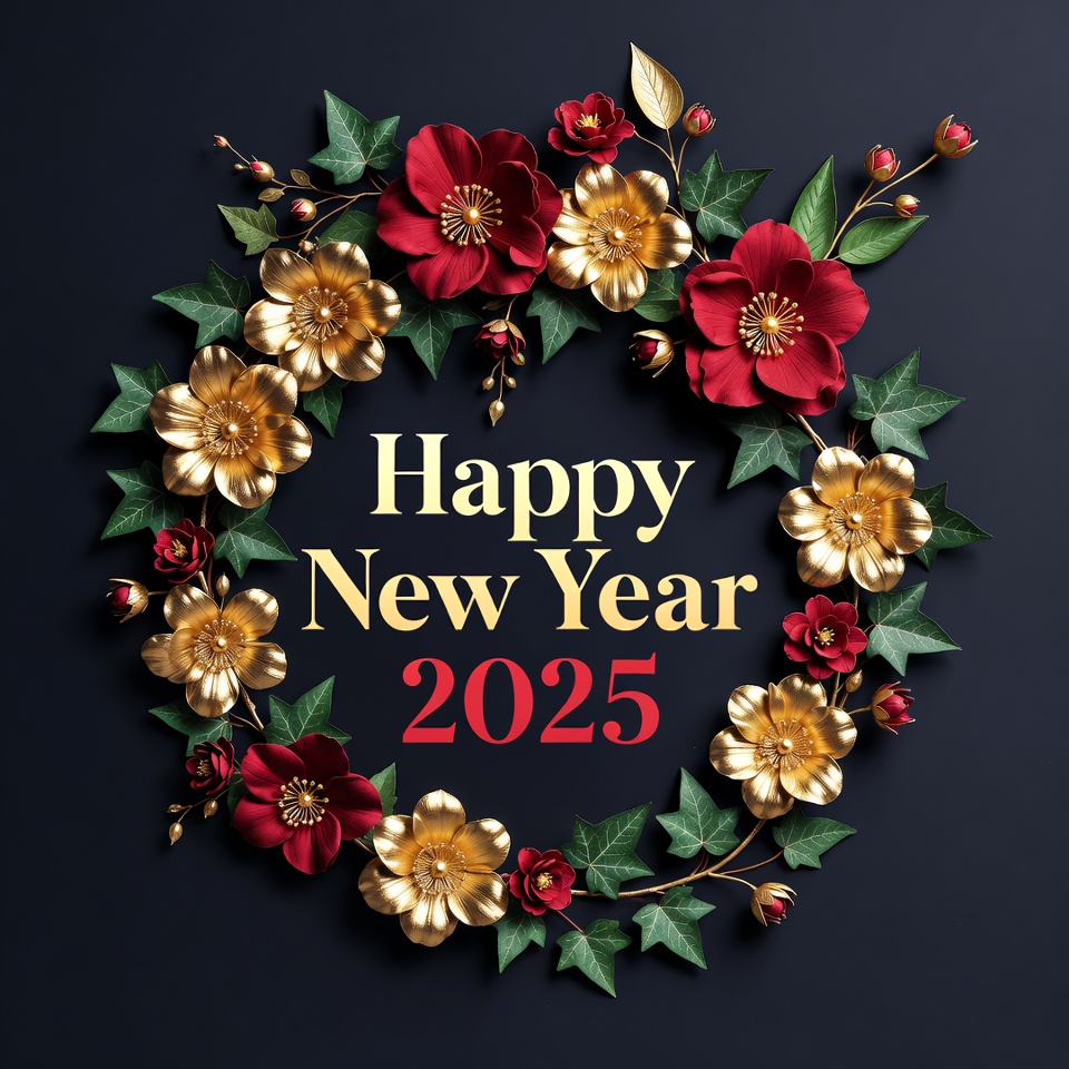 A floral wreath features red and gold flowers with greenery. The text displays a greeting for the New Year 2025.