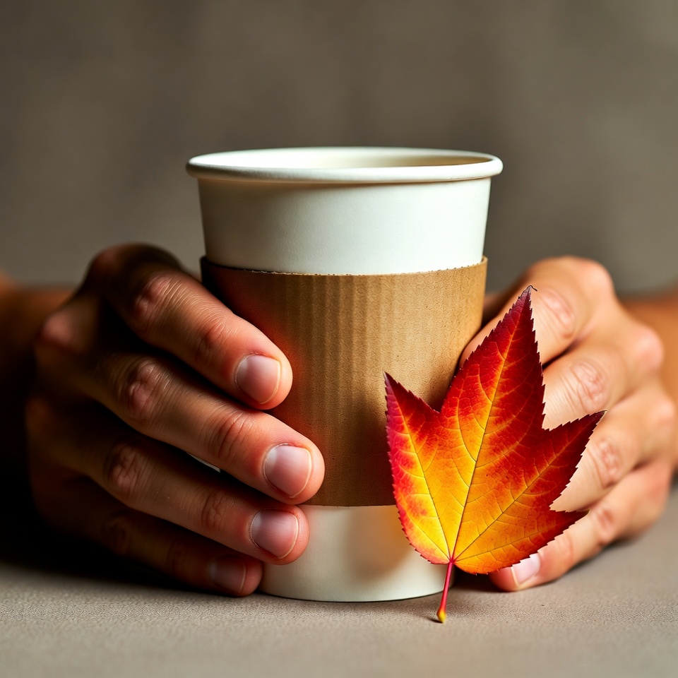 Hands are holding a takeaway coffee cup with a brown sleeve. An autumn leaf rests against the cup, showing fall colors.