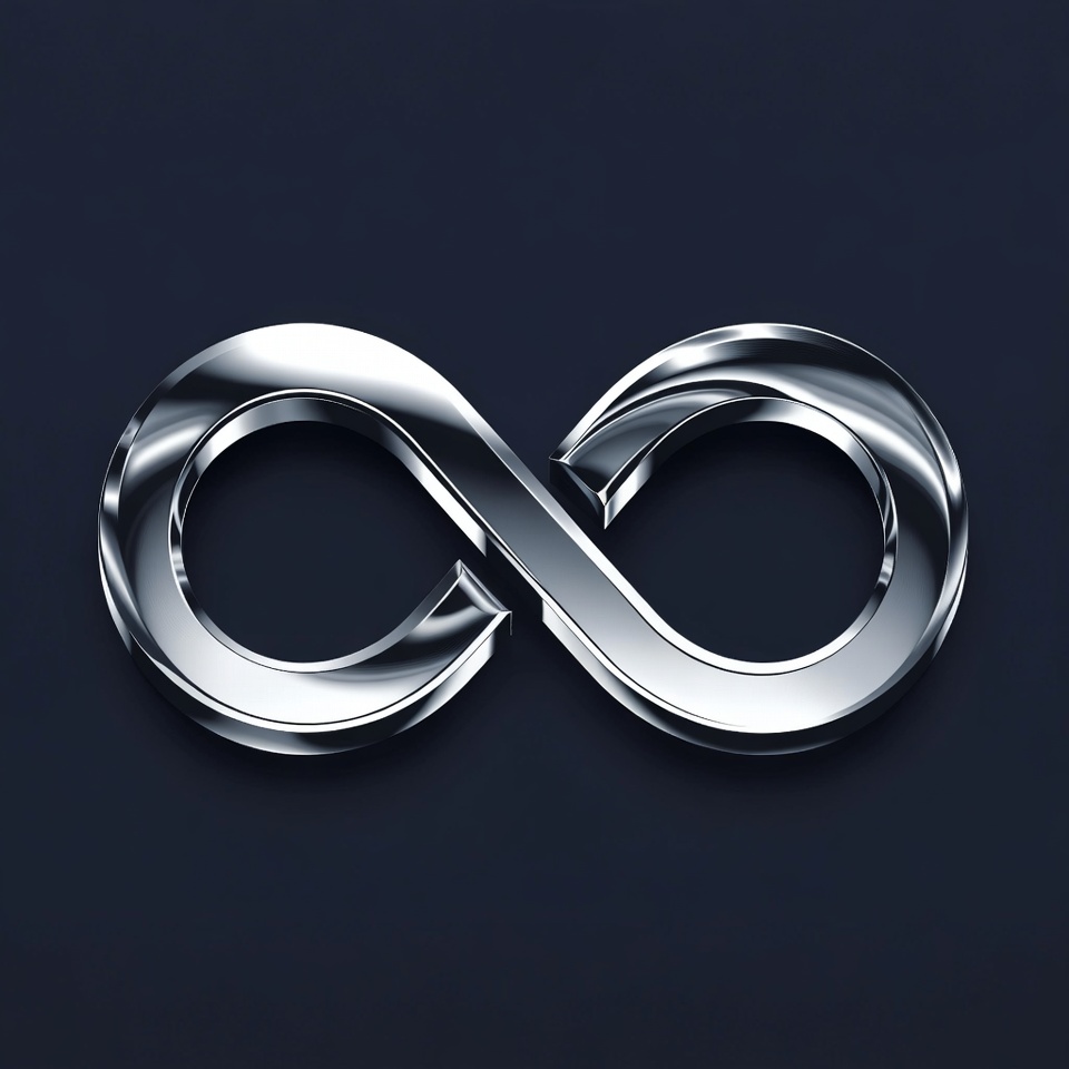 A metallic infinity symbol sits on a dark background. The symbol reflects light and has a smooth, polished surface.