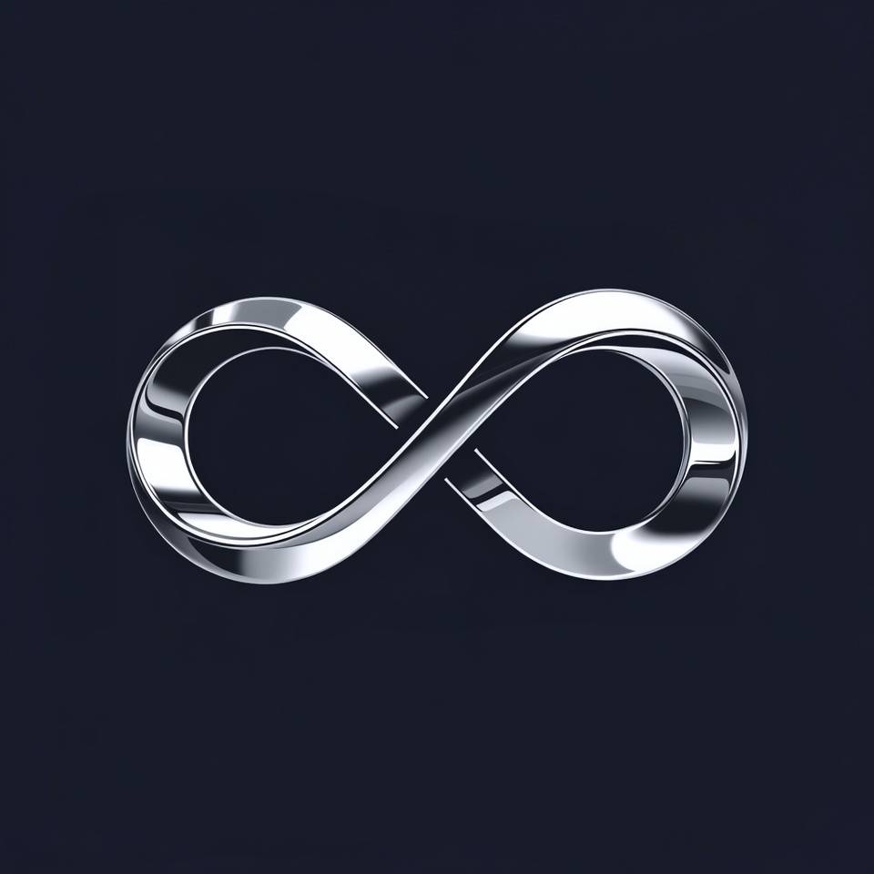 A shiny silver infinity symbol sits on a dark surface, showcasing its smooth curves and reflective surface in natural light.