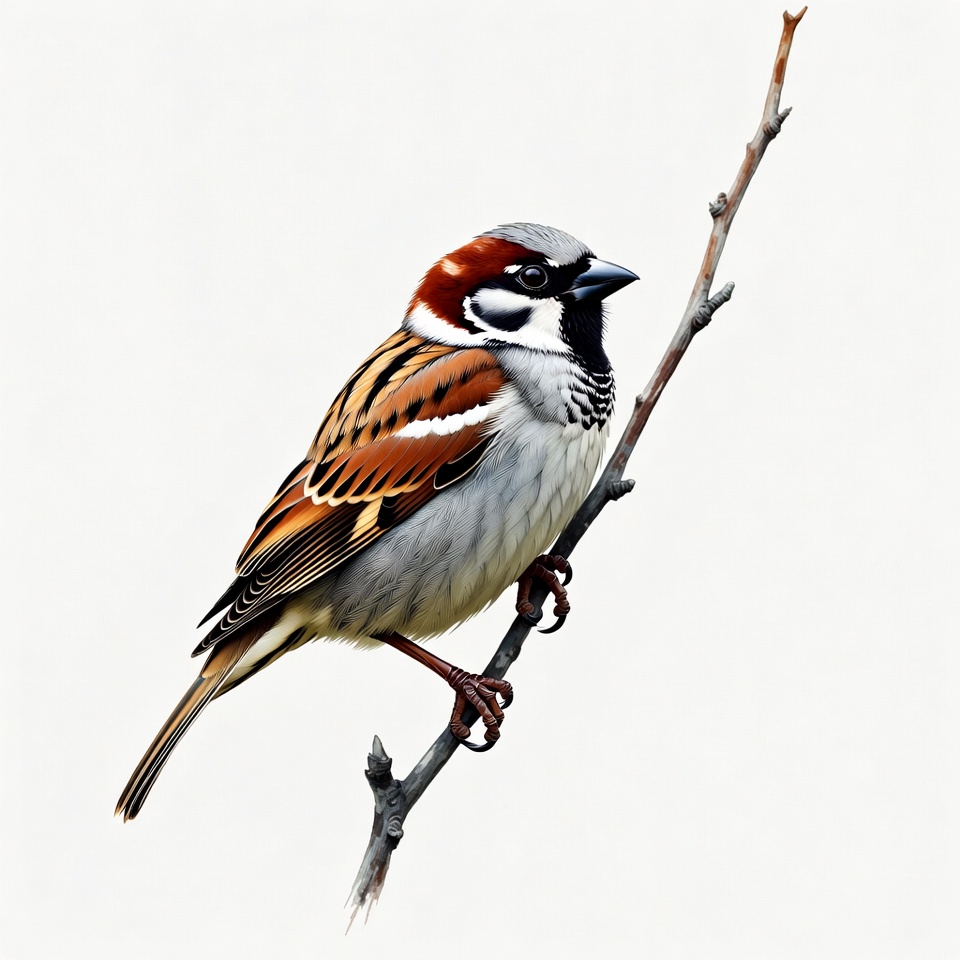 A sparrow is sitting on a thin branch. The bird shows various colors and patterns on its feathers. It is daytime and the setting appears simple.