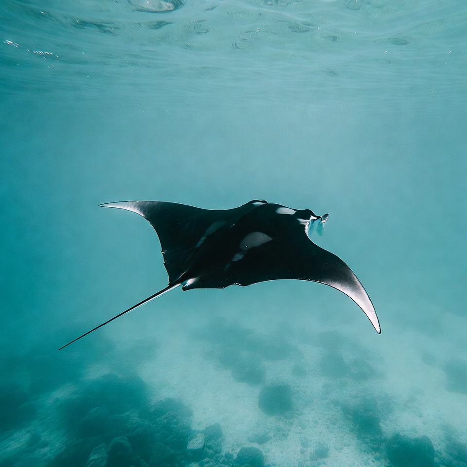 animal movement, aquatic, aquatic habitat, biodiversity, captivating, clear water, exploration, fish, manta ray, marine life, nature, ocean, ocean depths, ocean floor, sea, swimming, swimming gracefully, swimming motion, underwater, wildlife